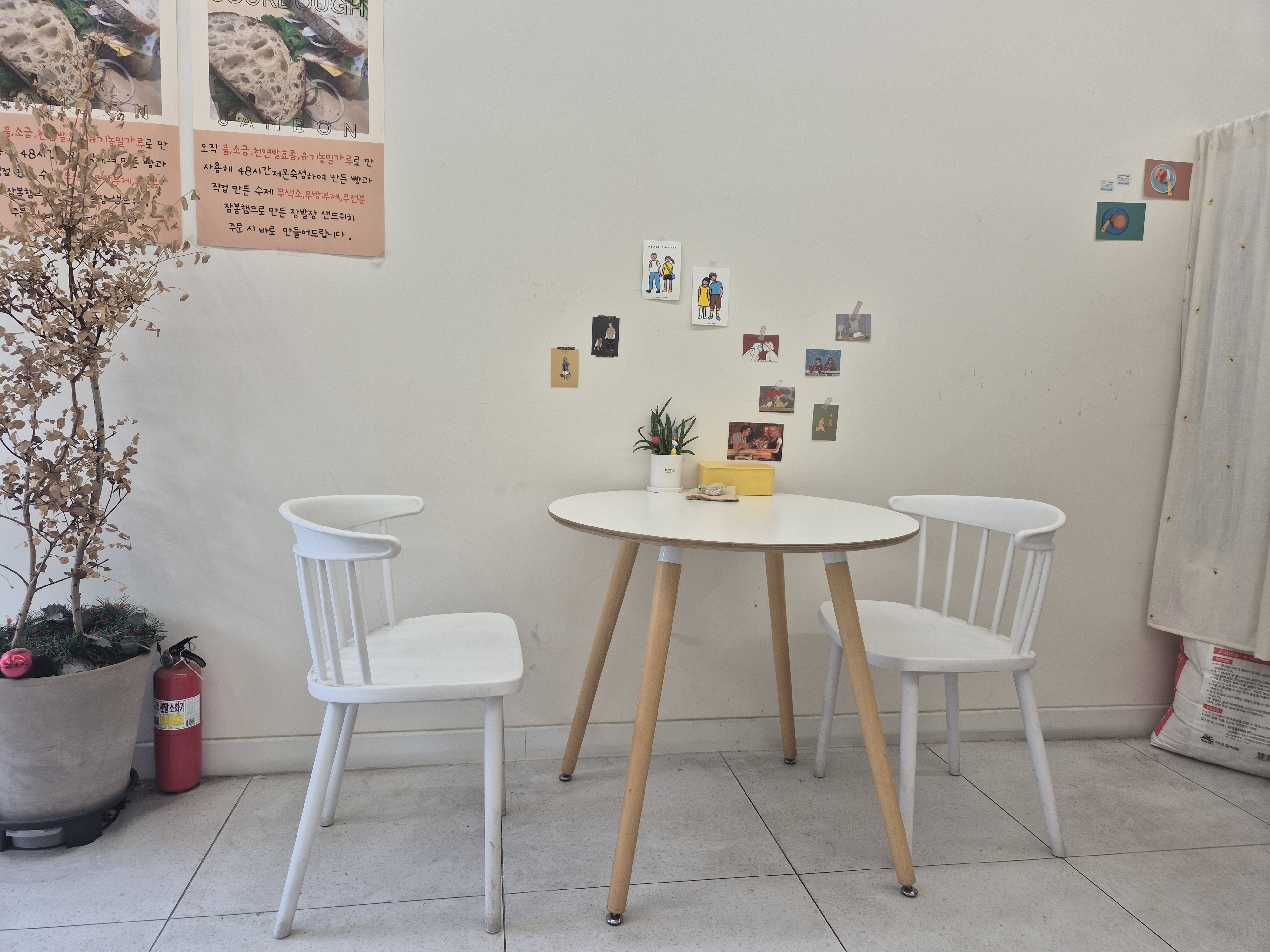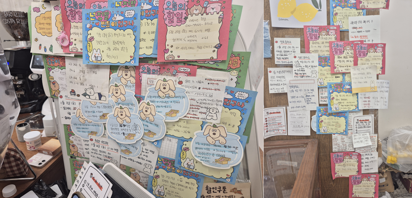 가게 안은 아기자기한 브런치 카페 느낌이었고, 테이블은 두 개뿐이었지만 책을 읽기에도 좋을 듯한 아늑한 분위기였습니다. 주문하려고 카운터에 다가가니, 포천 관공서 등에서 들어온 단체 주문 메모가 빼곡히 붙어 있는 게 눈에 띄었습니다.